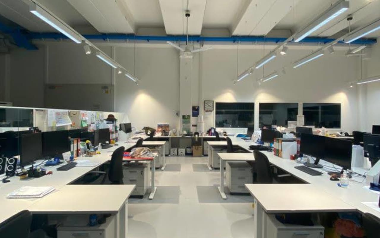 Abbiamo progettato il nuovo impianto sfruttando le nuove tecnologie di illuminazione a Led. La scelta è ricaduta su plafoniere a Led, montate a soffitto e sulle postazioni di lavoro per avere una luce diffusa su tutto l’ambiente.